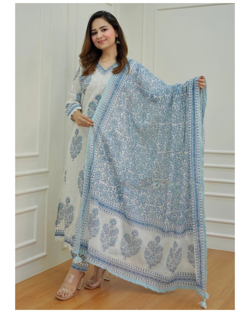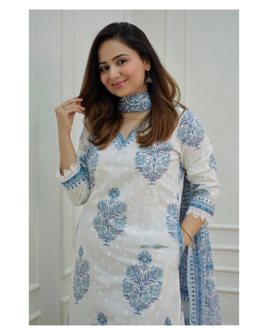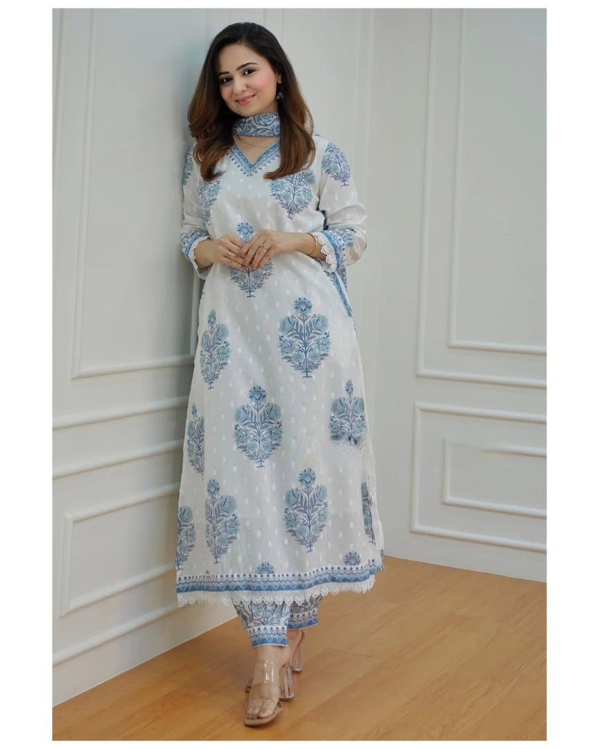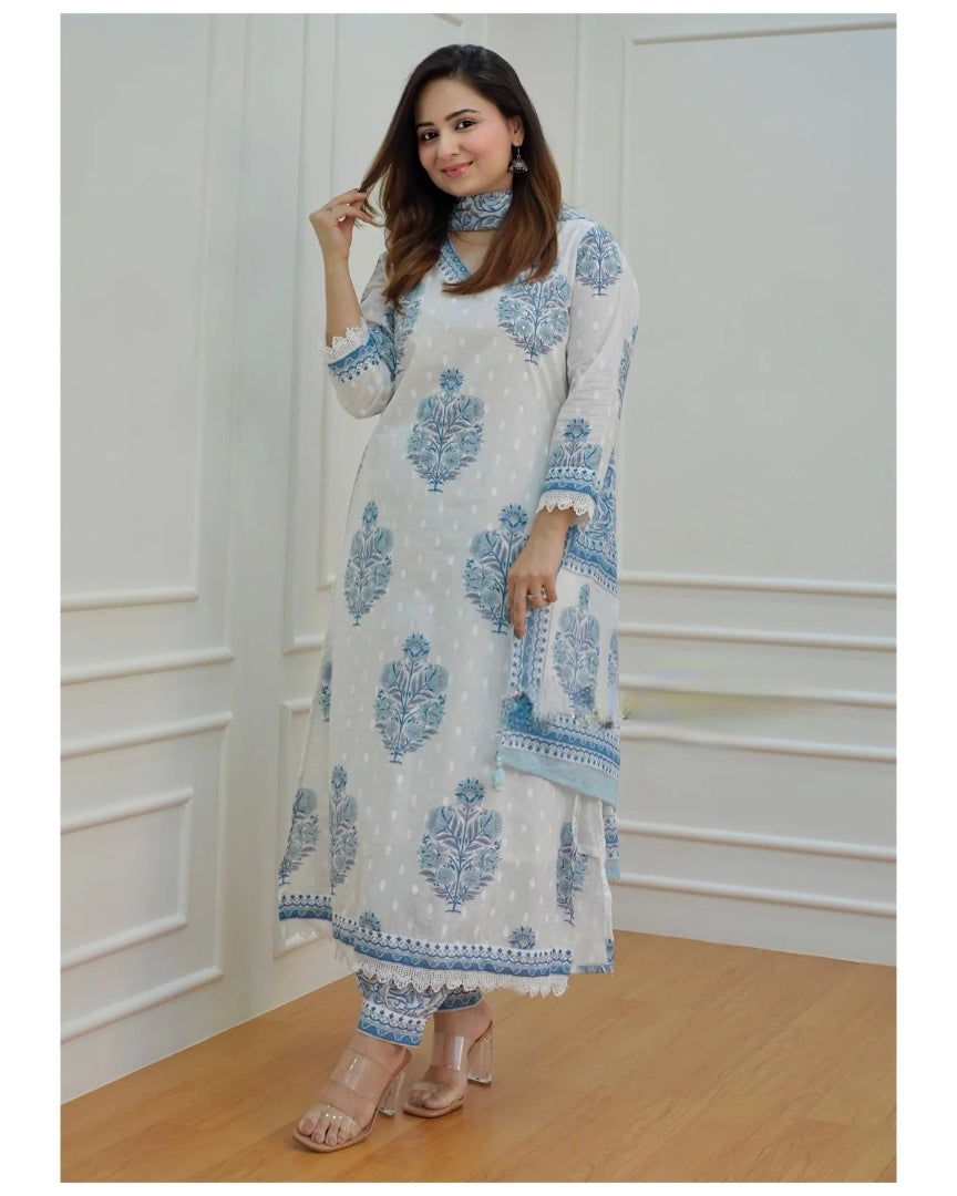 Featuring Beautiful A-line Cotton Suit which is has beautiful lace detailing and prints. It is very easy breezy and comfortable as it looks. It is paired with matching lace pants and cotton Dupatta.