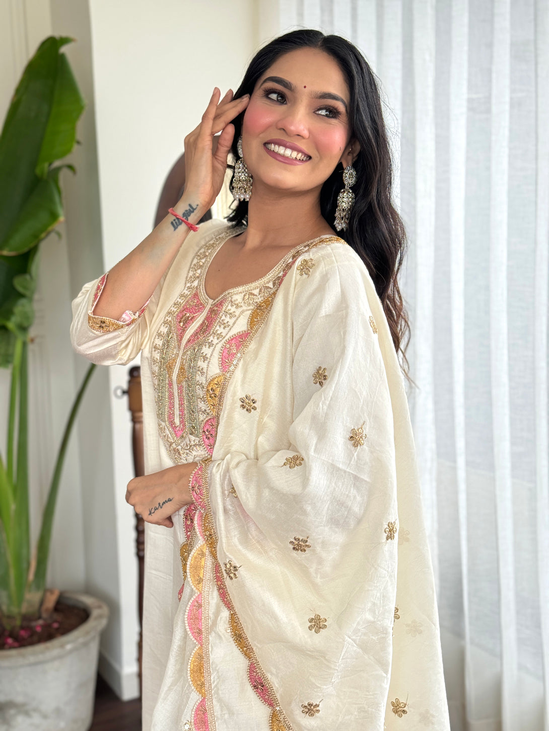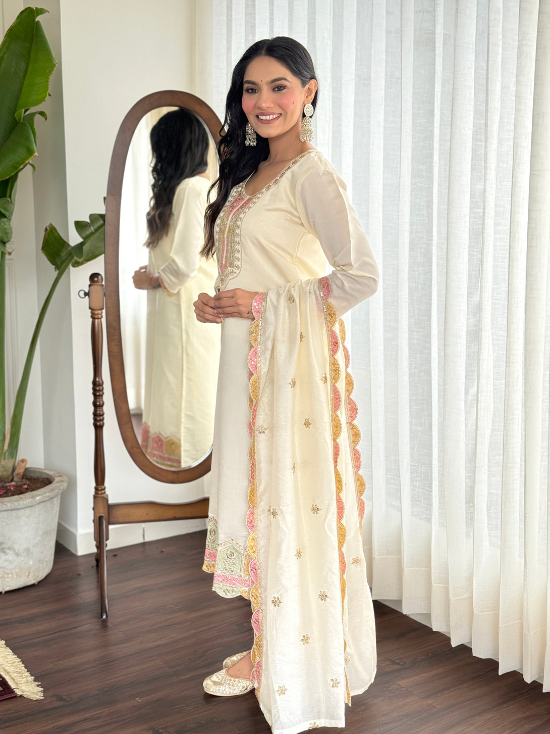 Ivory Vanilla Pastel Petals Threadwork A Line Suit