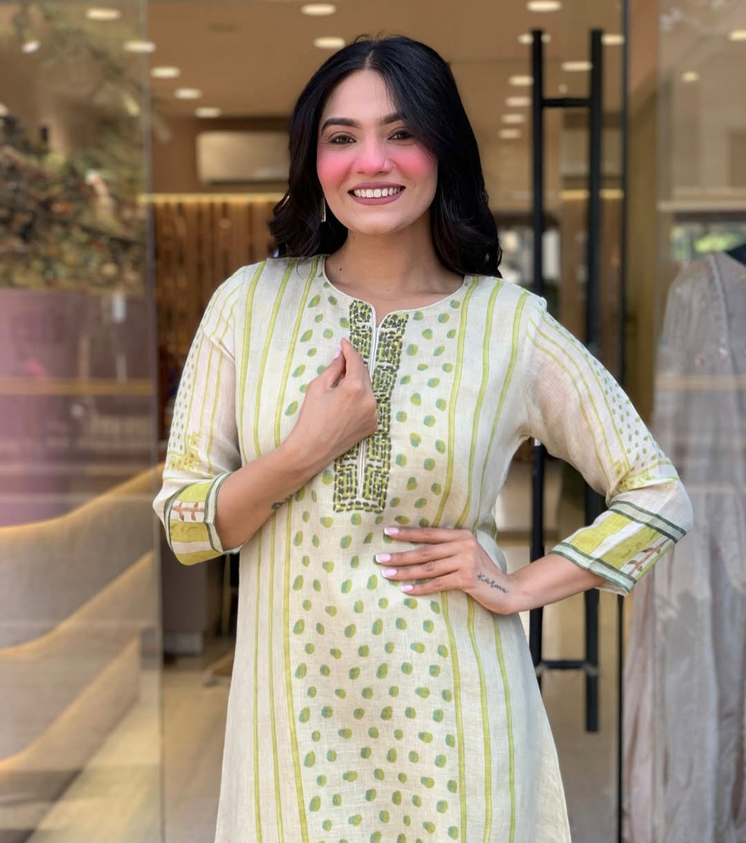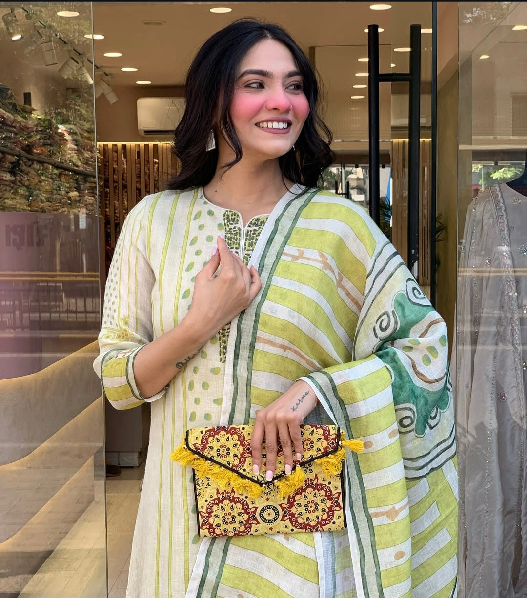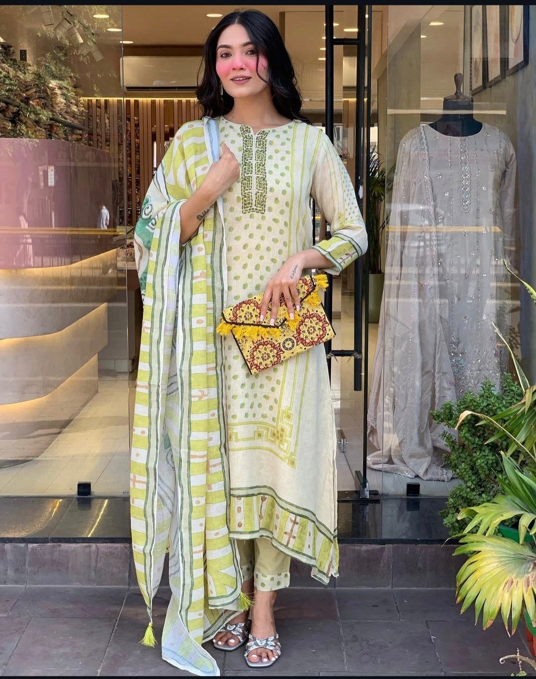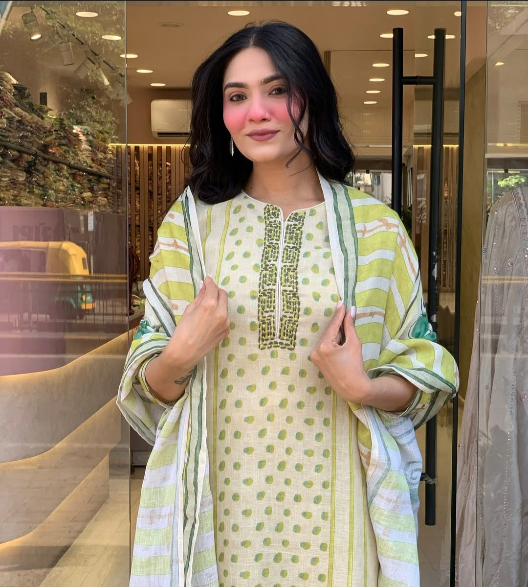 Whether it’s a casual summer gathering or a festive celebration, this outfit is your perfect companion for the season. Style it with minimal jewelry and a pair of classic juttis for a look that speaks of understated sophistication.