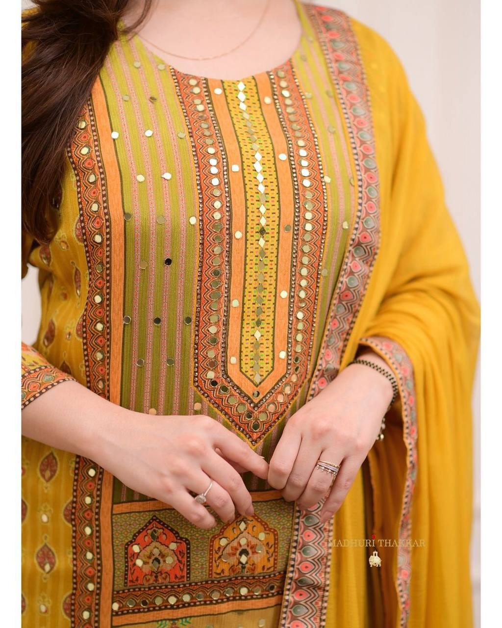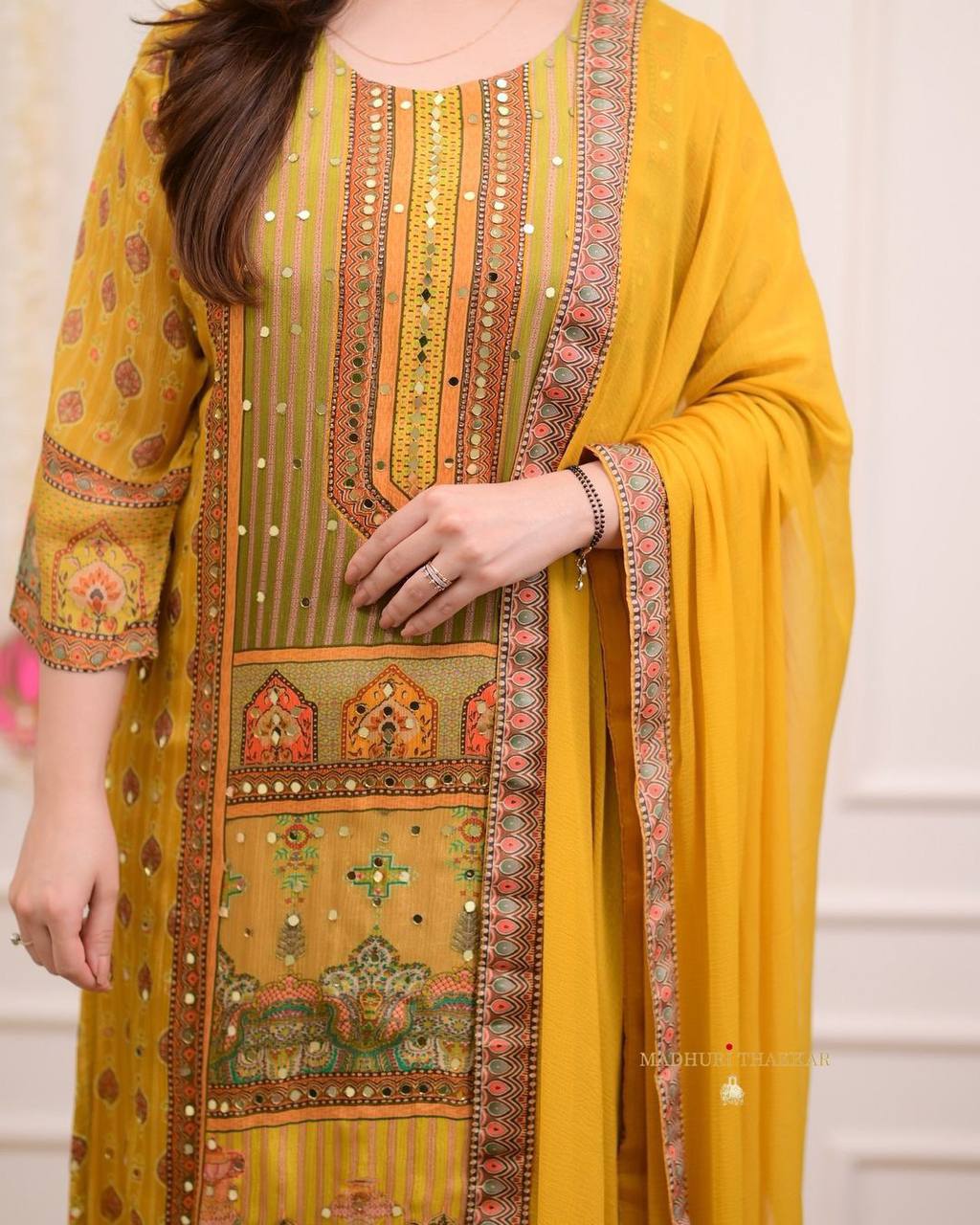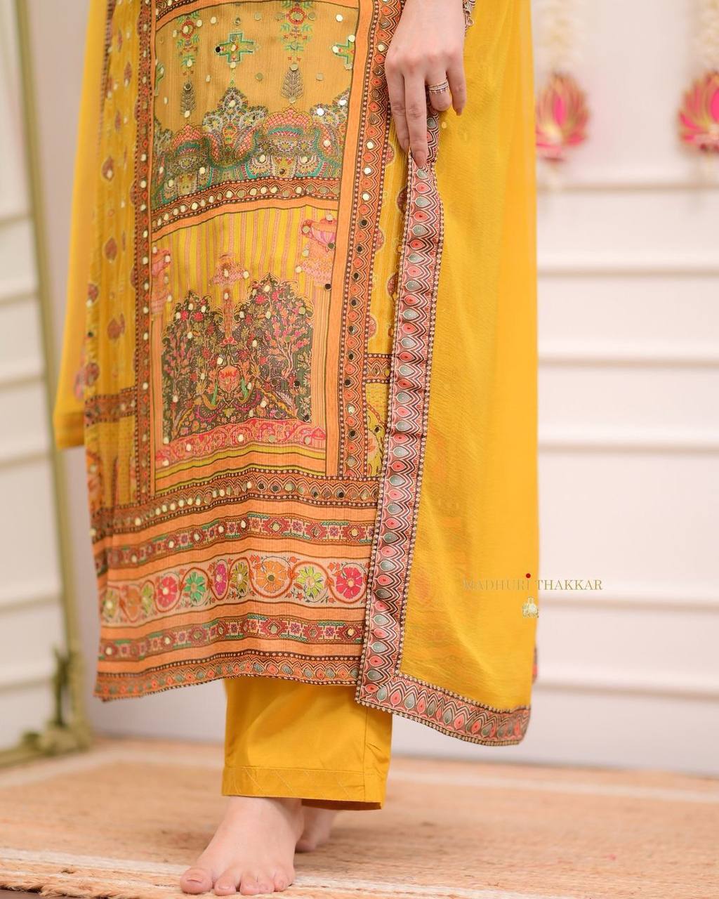 "Mustard Yellow Printed Suit Set with Intricate Mirror Work – Ethnic Charm Collection"