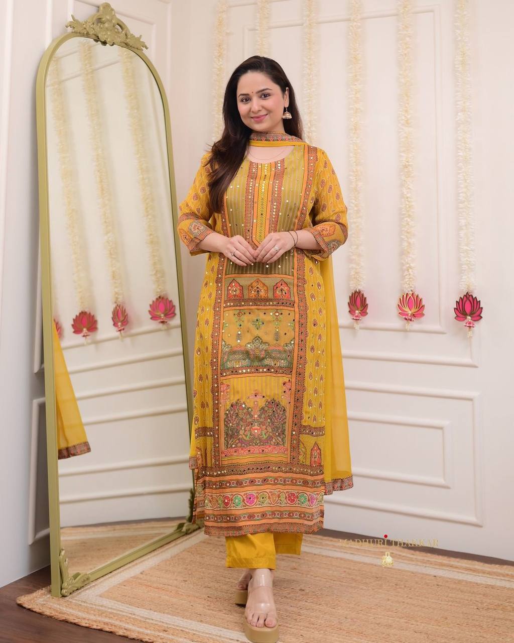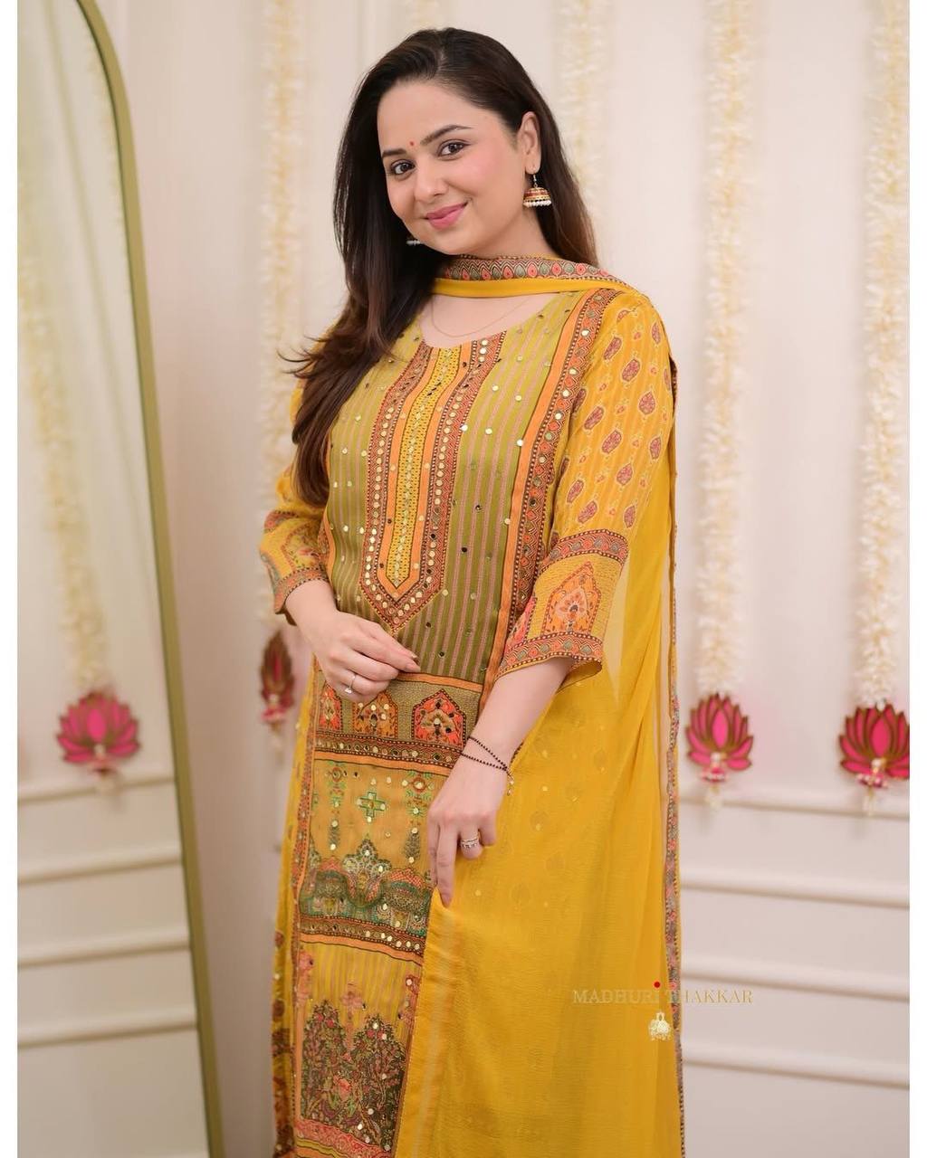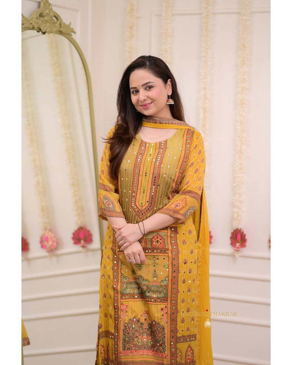 "Mustard Yellow Printed Suit Set with Intricate Mirror Work – Ethnic Charm Collection"
