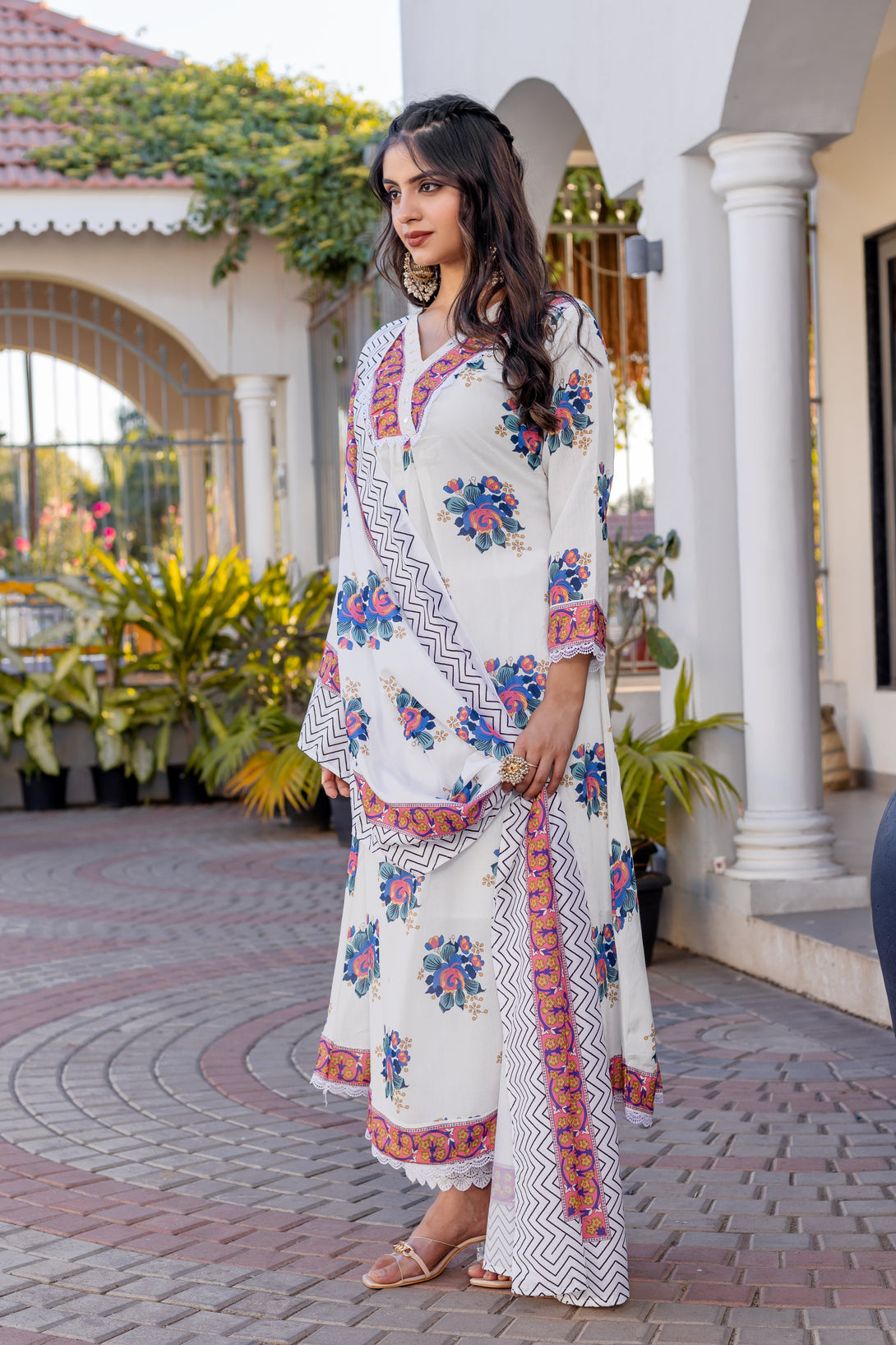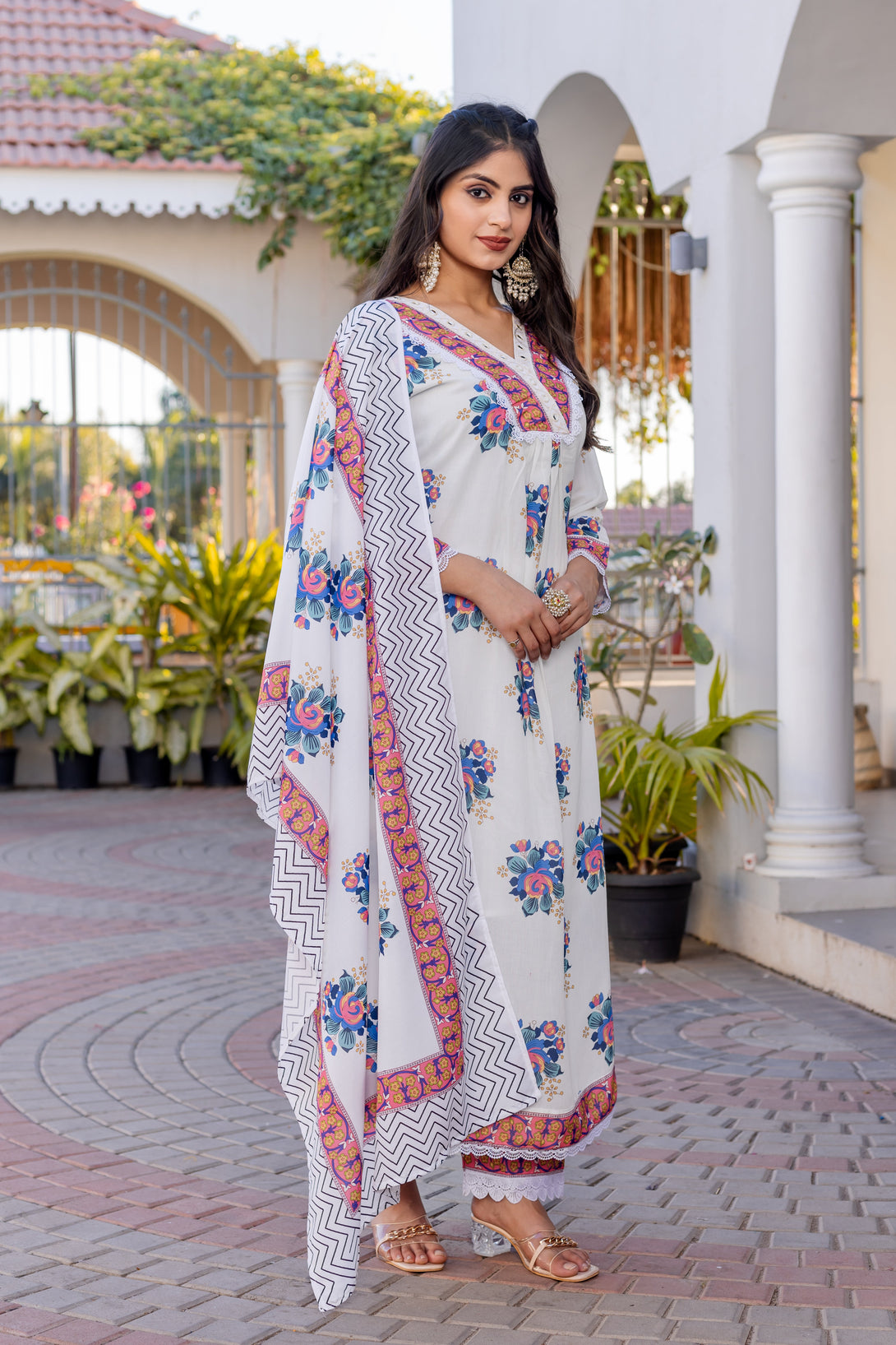 *Flaunt the amazing white color of this suit in your upcoming festivities. The divine and luxurious cotton fabric with digital Print gives it elegant look. It is decorated suit set with embroidery Nack work and lace work* *It comes with full lining!*